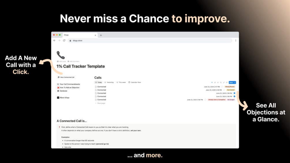 Because top performers don't just make more calls, they learn more from every single interaction. This isn't some basic spreadsheet. It's a complete call tracking system that helps you identify winning scripts, master objections, and spot exactly what separates your best days from your worst days. You'll finally know why you're succeeding instead of just hoping it happens again.