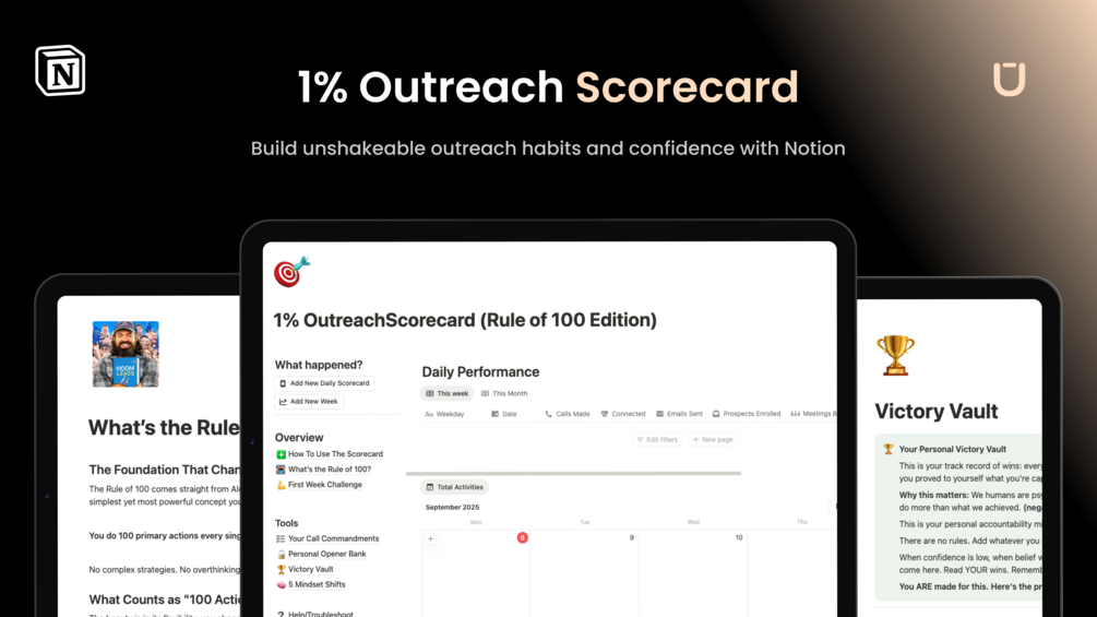 1% OutreachScorecard is a powerful and comprehensive Notion template that helps you dominate outreach through systematic tracking, optimisation, and mindset mastery.
